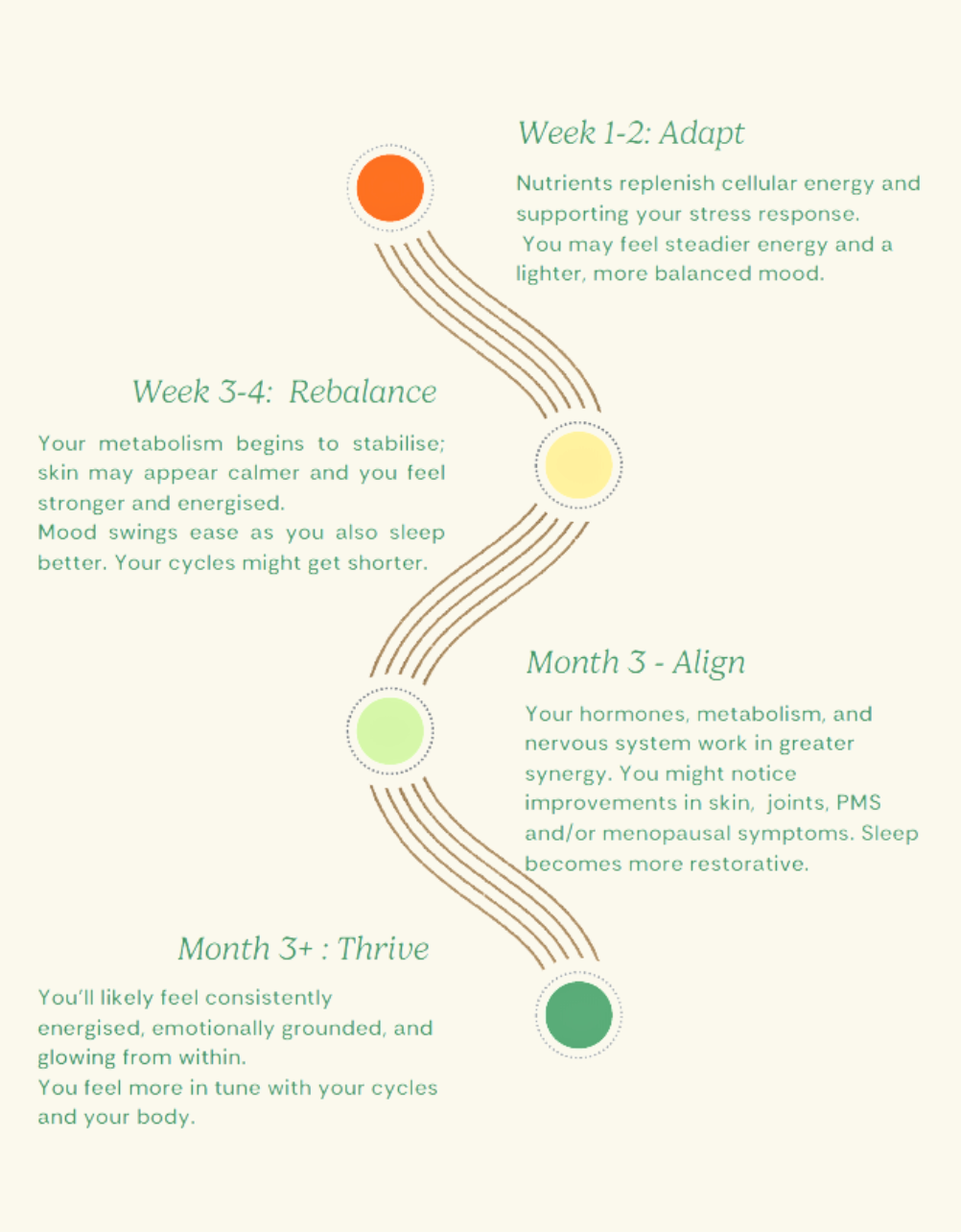 Every woman’s body will respond differently and in her own time but most notice subtle, positive shifts as the weeks unfold. Below is a general overview: